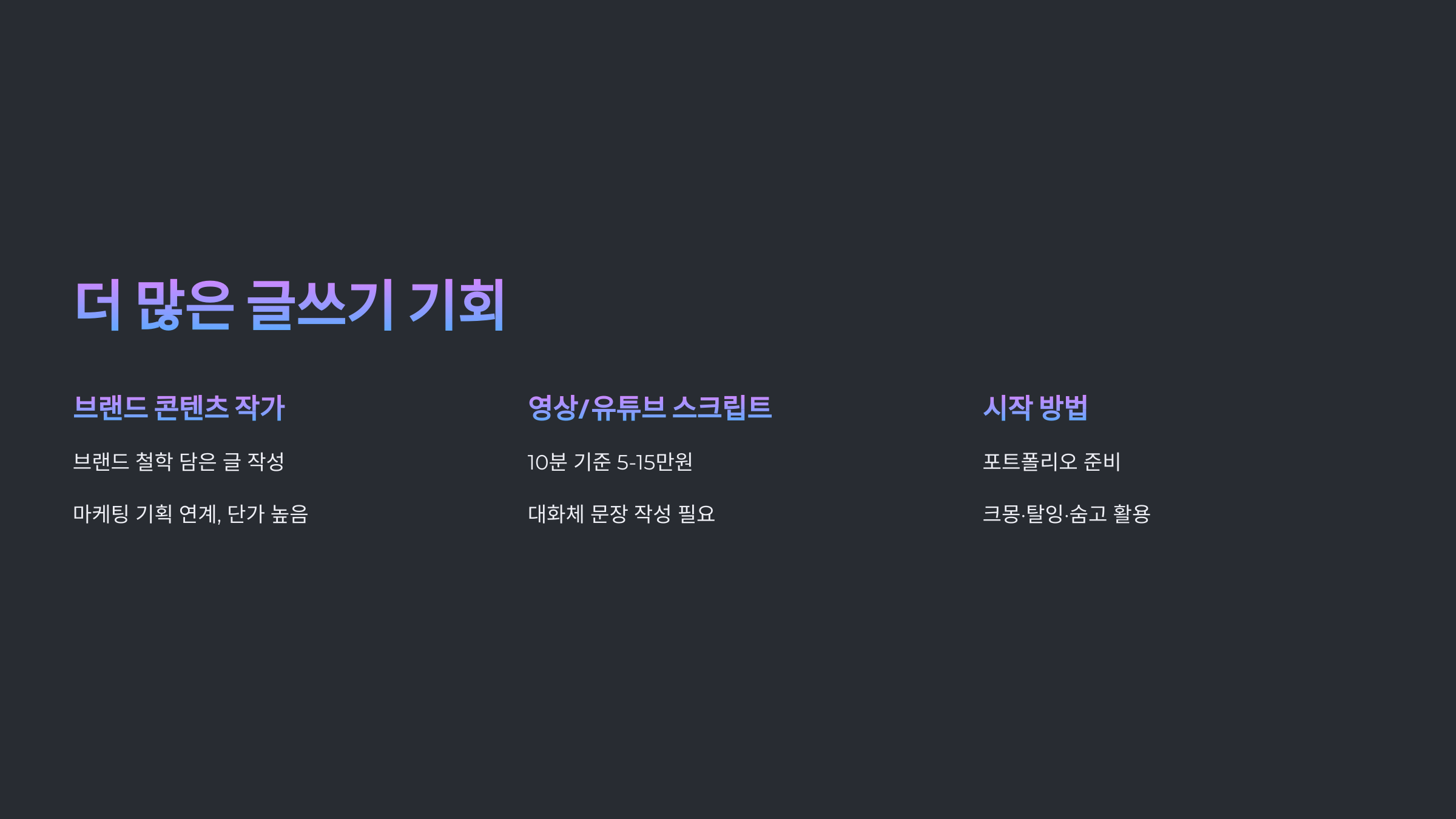 | 카피라이터 | 문구당 1~2만원 이상 | 브랜딩, 마케팅 중심 카피 |